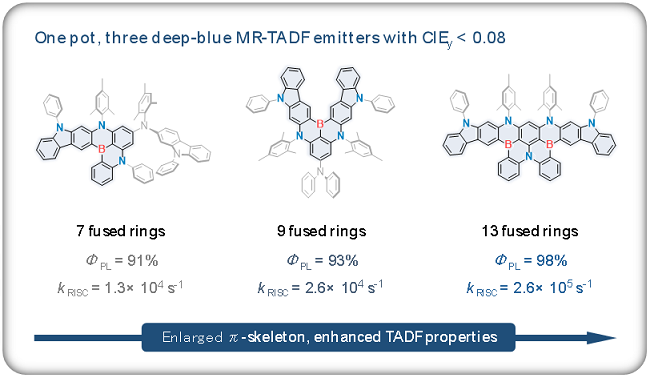 窄发射有机发光材料对高分辨和宽色域的OLED显示技术尤为重要。相比于传统的给受体型热活化延迟荧光(TADF)材料,多重共振型TADF(MR-TADF)材料由于可以同时实现窄发射和高效率,引起了学术界和产业界的极大兴趣。