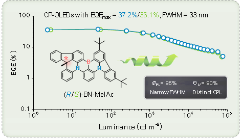 具有窄发射的圆偏振电致发光器件(CP-OLED)在3D显示领域具有广阔的应用前景,然而相应发光材料鲜有报道。作者首次将手性sp3碳单元引入到硼氮芳香稠环骨架中,构建了一组具有高构象稳定性的MR-TADF对映异构体,实现了分子刚性、中心手性和圆偏振效应的有机结合。相应OLED器件表现出明显的圆偏振电致发光信号,同时半峰宽仅为33 nm,外量子效率达到37.2%,且效率滚降较小,是目前已报道绿光CP-OLED的最高效率。该工作为高效窄发射圆偏振电致发光材料提供了一种简单可行的设计思路。深圳大学杨楚罗教授、曹啸松助理教授为共同通讯作者,硕士研究生杨熠宇、副研究员李能泉为共同第一作者。全文链接见:https://onlinelibrary.wiley.com/doi/abs/10.1002/anie.202202227。