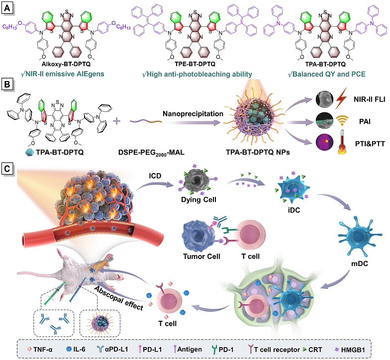 图1NIR-II AIEgens的设计、TPA-BT-DPTQ NPs的制备及其在光热协同免疫抗肿瘤中的应用