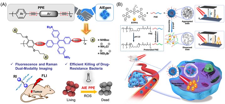 荧光成像因其简便快速、直观灵敏、实时追踪等优势而被广泛应用,但是荧光探针对细胞的微环境较为敏感且易受到组织自发荧光背景干扰;相比之下,拉曼成像具有零背景干扰、信号稳定等优势。具有荧光/拉曼双模态成像效果的探针能够结合两种成像模式的优点,实现高对比度且高灵敏度的生物成像,在手术导航等方面具有重要的应用价值。鉴于此,作者设计并合成了一系列具有AIE特性的PPE材料,既解决了传统的PPE共轭聚合物聚集态荧光效率低的情况,又充分利用了PPE类聚合物固有的炔基拉曼信号增强效应,实现了荧光和拉曼信号的双重增强效果,是一种新型荧光/拉曼双模态成像探针;通过侧链功能化得到的PPE聚电解质可以选择性地对进行细菌荧光成像,并且可以基于光动力高效杀伤革兰氏阳性菌和耐药菌(图A)。除了利用AIE材料优异的成像和光动力效果,作者进一步发展了具有“扭曲的分子内电荷转移(TICT)”效应的、带有正电荷的AIE光热试剂,通过采用pH响应型聚合物作为载体来调控该光热试剂在癌细胞中的聚集状态,有效实现了光热试剂从聚集态到分散态的转变,相应的刺激响应型聚合物纳米颗粒体系表现出优异的癌症光热治疗效果。
