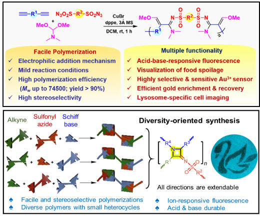 由多组分有机小分子反应衍生而来的多组分聚合方法具有原料简单、操作便捷、条件温和、环境友好、反应高效、产物结构多样等优势,可以通过简单的操作步骤高效合成结构新颖/复杂的聚合产物,是构筑多功能高分子库的有力手段。近期,作者相继开发出两种铜催化的炔烃、磺酰叠氮和亲核试剂的多组分聚合反应,构筑出一系列富含杂原子的杂链/杂环功能高分子。在工作[2]中所报道的多样性导向合成策略充分体现了多组分聚合在高效构筑结构新颖复杂的聚合产物库方面的独特优势,为拓展功能聚合物材料的结构多样性和功能化应用提供了新的思路。所得到的AIE杂链/杂环聚合物在海产品腐败检测,金离子的检测、富集与回收,Pd2+和与Cr2O72-的荧光检测,以及特异性细胞器成像等应用中均表现优异。基于近年来的相关研究工作积累,该团队受邀对基于三键聚合方法制备AIE功能稠杂环聚合物的工作进行了系统性总结,并对该领域的发展前景与挑战进行了展望[3]。