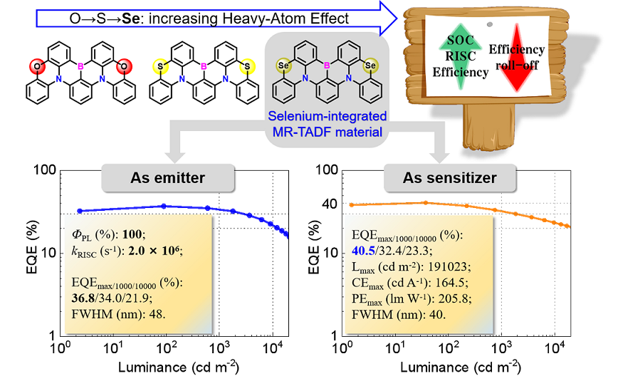 为了解决效率滚降的关键难题,深圳大学杨楚罗教授团队将非金属重原子硒元素嵌入多重共振骨架中合成了BNSeSe,利用重原子效应增强材料单、三线态(S1和T1)轨道之间的耦合作用,从而实现极高的kRISC(2.0 × 106 s-1)和光致发光量子效率(100%)。