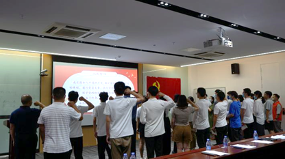 宣誓大会在雄壮的《国际歌》中拉开序幕。18名新党员依次上台,由党支部书记为他们佩戴光荣的党员徽章,发放“党员政治生日”贺卡。接着,熊静带领党员面向党旗宣誓,大家高举右拳,坚定地对党作出庄严承诺,掷地有声的誓言诠释着对党的忠诚和为共产主义事业奋斗终生的决心。新党员代表曾海飞发言,他表示,党员要牢记初心和使命,全心全意为人民服务,关心国家大事,不断提高自己的思想认识水平,坚定政治立场,在生活、工作、学习等方面发挥党员的先锋模范作用。