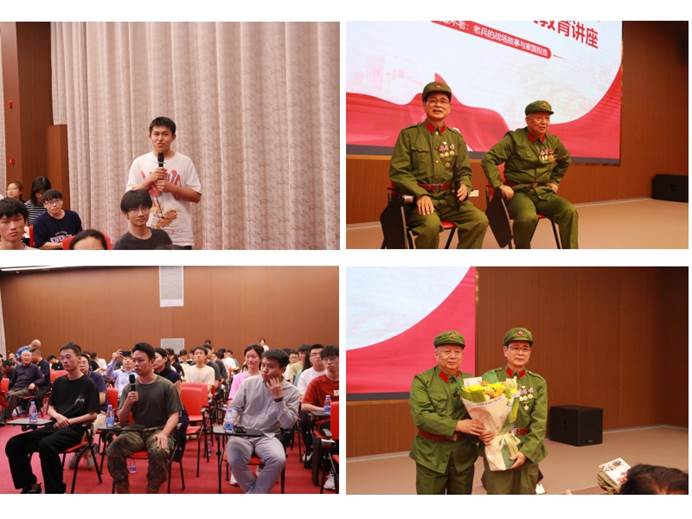 讲座进入交流环节,师生们积极踊跃地向两位老兵提问。“当时作战环境那么恶劣,是什么信念支撑着你们?”面对这一问题,邱映林老兵斩钉截铁地回答道:“保卫家国!”这简短的四个字,饱含着深沉的情感,深深打动了在场的每一位同学。“出征前,写请战书是什么感觉?”梁尚迎老兵感慨地说,当时心中只有为国家和人民而战的坚定信念,毫不犹豫地写下请战书,一心只想在战场上贡献自己的全部力量。“站在艰苦的年代的角度,我们现在的大学生应该怎么做?”两位老兵殷切希望同学们珍惜来之不易的和平,同时鼓励同学们努力学习,不断充实自己、提升自己,坚定信念、勇往直前,在实现中华民族伟大复兴的征程中贡献自己的力量。