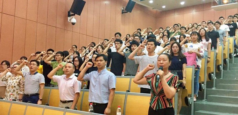 2018年6月27日12点30分在B1一楼报告厅,西丽校区四院联合举办预备党员入党宣誓大会。学生部副部长梁杰老师(生命与海洋科学学院副书记)、材料学院黄佳副书记、化学与环境工程学院孙宁副书记、医学院肖向东副书记、四位学院党务秘书、61名预备党员参与宣誓活动。本次活动由材料学院学生党务工作委员会筹备,化学与环境工程学院孙宁副书记主持。