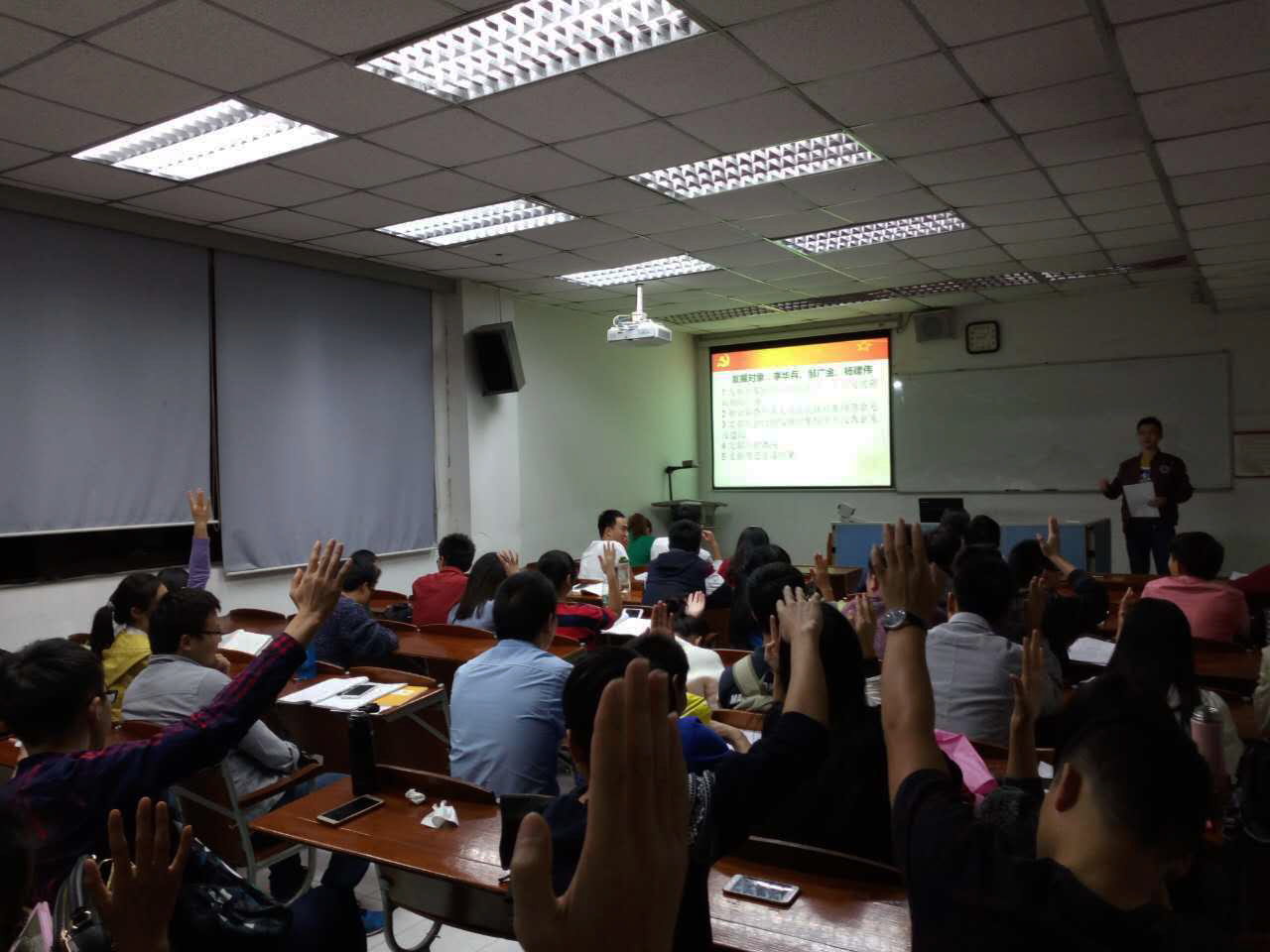 会议内容主要是对发展对象转为预备党员和预备党员转为正式党员进行表决和相关事宜讲解。大会严格按照接收预备党员和正式党员的相关规定进行,发展对象转为预备党员要经过以下流程:一.宣读入党申请书,并汇报发展期间情况,二.群众调查负责人发表调查意见 三.支部大会讨论并发表意见 四.支部大会表决 五.支部书记宣读结果。最终发展对象转预备表决情况:实到党员40人,李华兵40票,邹广金39票,杨建伟38票,实到有表决权的党员超半数同意以上三位同志成为预备党员,符合发展要求。预备党员转正与以上流程相似,须由本人提出转正申请,并介绍预备这一年的基本情况,交由支部大会讨论形成决议。最终,预备党员转正表决情况:实到党员41人(增加1人)全票同意吴海林、詹嘉、郑见璐、洪利萍、 罗垄垄、 雷帅、郭松波等7位同志转为正式党员。