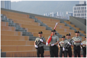 7点30分,主持人宣布升旗仪式正式开始。仪仗队踏着整齐坚定的步伐护送国旗走向升旗台,同学们庄严注视着国旗。待升旗手准备就绪后,军乐团奏响激昂的《义勇军进行曲》,全体师生肃立,唱响国歌。五星红旗冉冉升起,飘扬在风中。