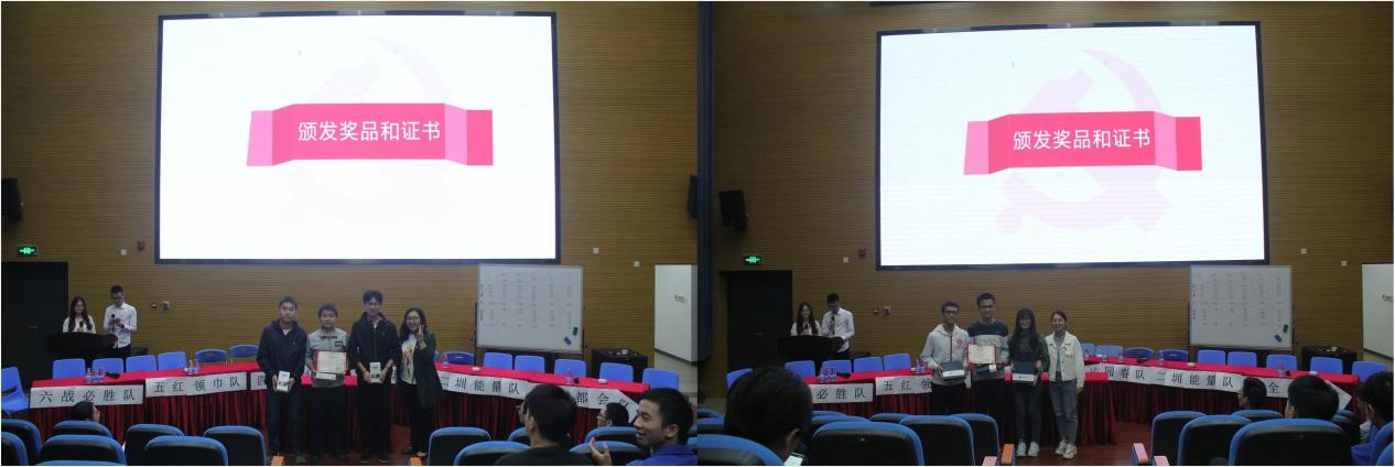 随后,进行党建知识竞赛,内容涵盖党章党规、条例准则及党的十九大等方面,分为积分赛、抢答赛和观众互动环节。参加本次党建知识竞赛的是来自学生党支部的红领巾队、全都会队、战必胜队、小红心队、圳能量队和沁园春队等六支队伍。在积分赛环节,选手们面对提问胸有成竹,应答如流,而在抢答赛环节,整场比赛进入高潮,比分逐渐拉开差距,比赛现场气氛热烈。经过激烈的角逐,最终来自2017级研究生党支部的小红心队获得一等奖;本科生党支部的红领巾队获二等奖;本科生党支部的战必胜队和2018级研究生党支部的圳能量队获得三等奖。