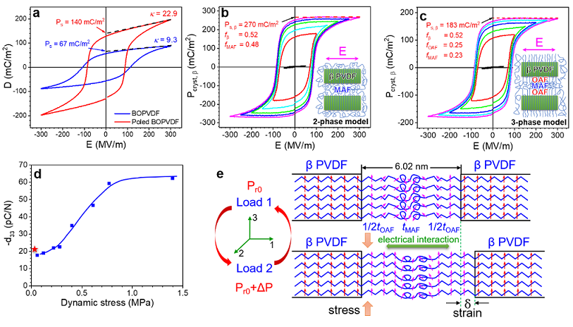 图1. (a) BOPVDF极化前后的D-E迟滞回线;极化BOPVDF P-E loop曲线对应的(b)晶体-无定形区两相结构和(c)晶体-取向无定形组分-无规无定形组分三相结构;(d)极化BOPVDF在不同动态应力下的压电系数;(e)极化BOPVDF产生正压电性能的模型图。图片根据原文重新组合。