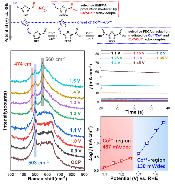 在前期工作中,骆静利院士团队制备了硫化铜/镍钴氢氧化物核壳纳米阵列及多级纳米结构的镍钴双氢氧化物用于5-羟甲基糠醛的选择性氧化(J. Mater. Chem. A 2020, 8, 1138;Appl. Catal. B-Environ. 2020, 278, 119339)。本工作中研究团队通过结合电化学测试、原位拉曼光谱测试、产物表征及理论计算深入探讨了电化学氧化条件下表面钴物种的氧化态与HMF氧化反应动力学及产物选择性的内在联系,阐明了原位生成的高价态Co3+及Co4+物种作为氧化剂参与HMF选择性氧化的不同本征催化活性。实验表明,Co3+仅能够催化HMF分子中醛基向羧基的缓慢氧化,而Co4+则能够实现羟基/醛基的快速氧化。基于该特征,该项工作首次实现了HMF电化学氧化产物选择性的调控:当所施加电压较低时,Co3+为主要活性物种,所得产物为5-羟甲基-2-呋喃甲酸(HMFCA);当所施加电压较高时,Co4+为主要活性物种,所得产物为2,5-呋喃二羧酸(FDCA)。同时,DFT理论模拟计算也与实验结果高度契合。