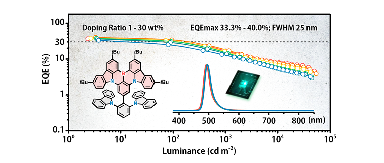 近日,深圳大学材料学院杨楚罗特聘教授团队采用在多重共振热激活延迟荧光分子的外围引入“挡板”基团(图示分子灰色片段),将多重共振母核(图示分子粉色片段)包裹在中间的策略,实现了窄发射光谱并抑制聚集诱导发光猝灭的目的。相应OLED器件性能获得大幅提升,在掺杂浓度为1-30%的区间内光谱几乎无变化,发光半峰宽仅为25纳米;在5%掺杂浓度下OLED器件实现了40%的发光效率,创造了目前国际上窄发射OLED器件效率的纪录,展示了在产业上的巨大应用价值。