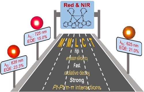 促进磷光材料的辐射跃迁速率是开发高性能OLED材料的关键。日前,深圳大学杨楚罗教授和李凯助理教授团队设计合成了一种新型的双核铂配合物,通过刚性分子桥强化分子内金属-金属作用实现了不依赖于分子间堆叠的高性能的红光和近红外光OLED。源于分子内的强Pt-Pt和π-π作用,该类材料体系具有良好的热稳定性,其红光和NIR发射效率分别超过60%和40%、且发光寿命短至1微秒左右。相应红光和近红外光OLED器件,其外量子效率分别达到23%和15%,且效率滚降小。尤其是,器件寿命研究显示了该类材料良好的稳定性,有望替代目前产业用铱配合物材料,具有巨大的应用潜力。