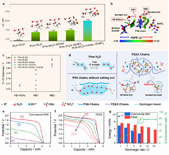 图1.(a-c)PZAS-PBS凝胶中氢键的理论计算, (d)阻碍质子传输原理图和(e-g)电解型MnO2-Zn电池性能。