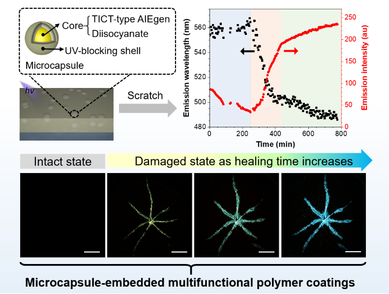 l进展二:利用AIE分子负载的多功能微胶囊实现高分子材料的损伤-自修复全过程动态可视化