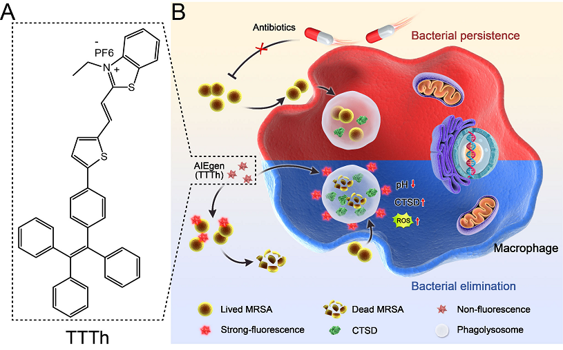 不断出现的细菌耐药性正使得传统抗菌药物逐渐失效,由超级细菌引起的感染已经严重威胁到人类安全,探索和开发新型抗菌药物变得日趋重要。与常见的直接靶向细菌的药物不同,宿主导向抗菌化合物旨在通过提升免疫细胞功能或介入病原体与细胞间的相互作用来抑制感染并杀死细菌。从人工合成分子中筛选新型药物可以有效弥补天然分子库的耗竭。近年来的研究发现,聚集诱导发光分子(AIEgens)具有各式各样生物活性,其在医学诊疗领域已经展现出了巨大的潜力。然而,基于优秀的光动力及光热性能,这些分子在调节抗菌免疫功能上的研究却仍处于起步阶段。