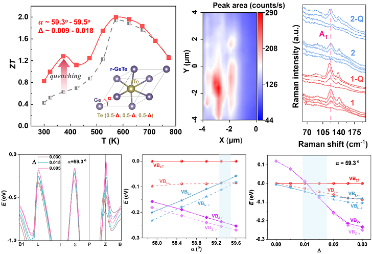通过调控成分和热处理工艺,可以获得一种新奇的亚稳态GeTe,能大幅提升该材料在低温范围内的ZT值。通过Raman、XRD、TEM、DFT分析,证明这种奇异的热电性能增强现象来源于GeTe基合金中特定晶体角度和原子位置偏移。该工作发现的新型相结构调控为实现热输运和电输运的协同调控提供了一类新途径,以“Anomalous enhancement of thermoelectric performance in GeTe with specific interaxial angle and atomic displacement synergy”发表在Cell Reports Physical Science (Cell杂志社新期刊)。该工作的第一作者为深圳大学材料学院硕士生汪龙泉(已毕业去日本读博),通讯作者有南京大学徐伟高教授、日本Takao Mori教授、张朝华副教授(Lead Contact)。