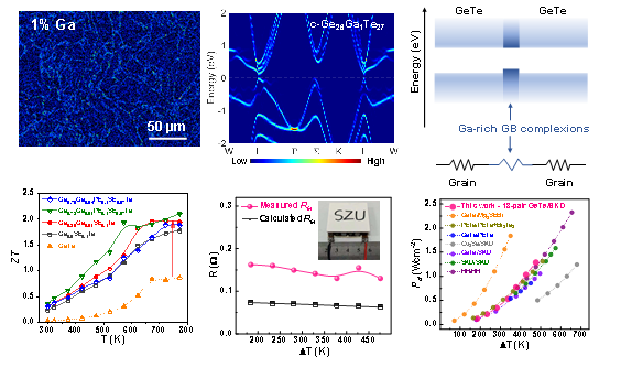 晶界作为多晶材料的关键特征,对热电性能具有关键影响。通过GeTe基合金中Ga元素的偏析获得了“Grain boundary complexions(晶界肤色)”,发现这种新型界面相对热输运和电输运的协同调控具有积极的作用。我们通过EPMA、APT、DFT等实验和理论研究揭示了该策略实现热电性能增强的机制,并组装了相关热电器件,获得了不错的输出功率。该工作提出的“晶界肤色”能为热电输运调控提供一个新的自由度,以“Grain Boundary Complexions Enable a Simultaneous Optimization of Electron and Phonon Transport Leading to High-Performance GeTe Thermoelectric Devices”发表在Advanced Energy Materials (影响因子:29.368,中科院一区)。该工作是深圳大学与德国亚琛工业大学共同完成,张朝华副教授为该工作的第一作者和通讯作者,另一通讯作者为余愿博士。硕士生晏淦和王毅博相继对本工作的完善做出重要贡献。