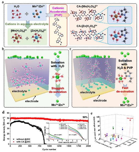 电解型MnO2-Zn电池的双沉积/溶解反应是基于金属阳离子的沉积/溶解反应:充电时,正极是由Mn2+沉积为MnO2(Mn2+→Mn4+),负极是由Zn2+还原为Zn (Zn2+→Zn);放电时,正极由固态的MnO2电离出Mn2+,负极由Zn电离出Zn2+,这些电离出来的阳离子又返回到电解液。因此,改善阳离子的沉积/溶解反应,有利于提高电解型MnO2-Zn电池在高面容量(高能量密度)下的电化学性能。然而,研究者们多关注于MnO2-Zn电池中金属离子间的反应,往往忽略了金属离子和水的配位作用。该工作通过理论指导与实验验证相结合的方法,组装阳离子促进剂调节的MnO2-Zn电池,发挥阳离子促进剂功能,加速电解液中阳离子迁移和推动电极-电解液界面充分的电荷转移,促进Mn2+/Zn2+阳离子的沉积和溶解过程,促使电解型MnO2-Zn电池能够在高倍率下进行高度可逆且长久的循环。CA调节的MnO2-Zn电池在20 C倍率下的能量密度高达50 Wh·m-2,功率密度高达1178.18 W·m-2。此外,CA调节的MnO2-Zn电池在20 C的高倍率下也能够保持高的能量效率和长期的循环稳定性(>2000)。具有优异电化学性能的CA调节的MnO2-Zn电池可应用于大规模储能领域。