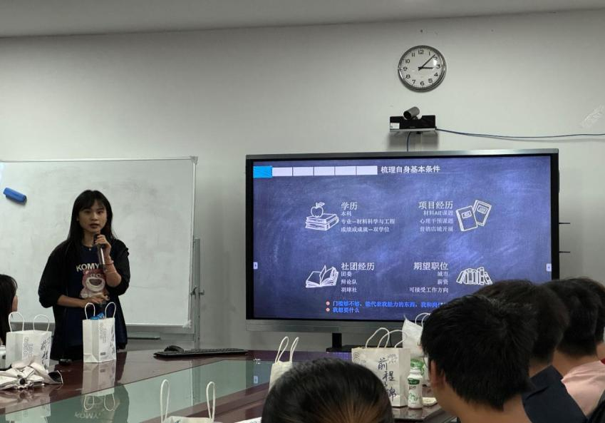 赵思怡,目前就职于华润东阿阿胶,曾担任材料学院团委副书记,她详细介绍了求职流程与面试心得,传授了许多经验以及实用技巧,帮助同学们对求职建立了一个较完整的认识,给同学们明确了努力的方向。