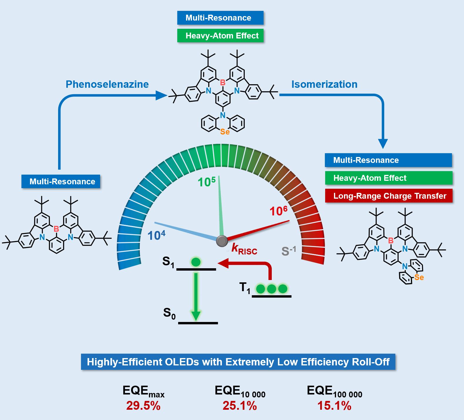 前沿OLED应用场景,诸如虚拟现实、透明显示需要在高亮度(超过10,000尼特)下工作,这对高亮度水平下的电致发光器件外量子效率(EQE)提出了高要求,甚至超越了最大外量子效率本身的重要性。为了在高亮度下实现高效的电致发光,发光材料需要兼具高激子利用率和短激子寿命。近年来,多重共振(multi-resonance, MR)热活化延迟荧光(thermally activated delayed fluorescence, TADF)分子因其兼具窄谱带发射和高光致发光量子效率(PLQY),成为未来高清显示OLED中极具前景的发光材料。TADF发光材料的反向隙间窜跃速(kRISC)对于实现具有低效率衰减的高性能OLED至关重要,然而,MR-TADF发光材料固有的、原子定域化的分子前线轨道分布特性通常导致其反向隙间窜跃过程较慢,使得其相应器件在高亮度下效率滚降明显。因此,设计具有高隙间窜跃速率(kRISC)的MR-TADF材料具有重要意义。2022年,杨楚罗教授团队已报道了通过在MR分子骨架中引入重原子硒以增强SOC,提升MR-TADF材料kRISC的方法(Nat. Photonics2022,16, 803-810)。随后,杨楚罗教授团队又于2023年报道了通过在MR骨架外围修饰电子给体,引入长程电荷转移激发态提升MR-TADF材料kRISC的方法(J. Am. Chem. Soc.2023,145, 12550-12560)。但总的来看,与基于重金属铱和铂配合物的传统磷光器件相比,MR-TADF材料的滚降仍然较大,亟待开发更加有效的提升MR-TADF反向隙间窜跃速率的方法。