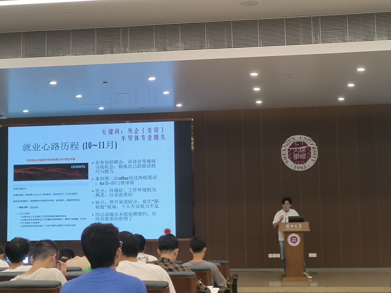 曾俊华,曾任院团委实践部部长,成功收到了比亚迪、Onsemi、深南电路等多家知名企业的录用通知,并最终决定加入海天味业。他深入地分享了自己的面试经历,并强调,对于求职而言,深入了解自我和企业的需求至关重要。他以自己的简历为实例,向同学们展示了如何根据兴趣选择课程,如何有效利用学校资源来接触企业、建立人脉,并建议同学们多向学长学姐请教,采纳他们的宝贵建议。他分享了一份求职“必坑指南”,旨在帮助同学们合理规划职业道路,避免陷入专业局限。他特别提醒同学们要关注真实的就业待遇和工作环境,以便做出更明智的职业选择。