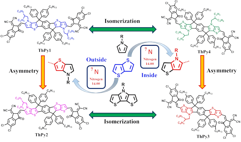 开发和合理利用新的构建单元对于设计高性能有机光伏材料,尤其是非富勒烯SMA,具有特别重要的意义。在大多数情况下,噻吩、噻吩并[3,2-b]噻吩及其衍生物是最常用的结构单元。与噻吩相比,吡咯是最富电子的五元单芳环,可以减小光学带隙,提升分子LUMO能级。同样,带有吡咯的三环二噻吩并[3,2-b:2',3'-d]吡咯(DTP)赋予了SMAs一些特殊的性质,包括小的带隙和浅的LUMO能级。迄今为止,几乎所有SMA的含氮结构单元都是由单环吡咯或三环DTP组成,而双环噻吩并[3,2-b]吡咯(ThPy)作为结构单元应用到非富勒烯SMA,甚至应用到整个有机电子领域都很少受到关注。基于此,我们以新型的ThPy为构建单元发展了四种新的A-D-A型SMA(ThPy1、ThPy2、ThPy3和ThPy4)。其中,ThPy1和ThPy4是一对具有中心对称结构的异构体,ThPy2和ThPy3是另一对具有不对称中心核的异构体。每对异构体中两个分子之间的区别在于中心核中吡咯环的位置:ThPy1和ThPy2中吡咯位于中心核外围,而ThPy3和ThPy4中吡咯环位于中心核内部。与对比分子IT-4Cl相比,基于ThPy的四个受体由于吡咯的强给电子能力而表现出吸收红移和前沿轨道能级上移的特征。密度泛函理论(DFT)计算表明,与ThPy1和ThPy2(N原子在外)相比,IT-4Cl、ThPy3和ThPy4(N原子在里)由于S•••O分子内非共价相互作用表现出相对更小的扭转角,十分有助于改善分子堆积和提高电子迁移率。器件结果表明,基于PM6:ThPy3的器件实现了15.3%的 器件效率(PCE)和高达77%的填充因子(FF),该效率是基于A-D-A型SMA的OSC的最高值之一。