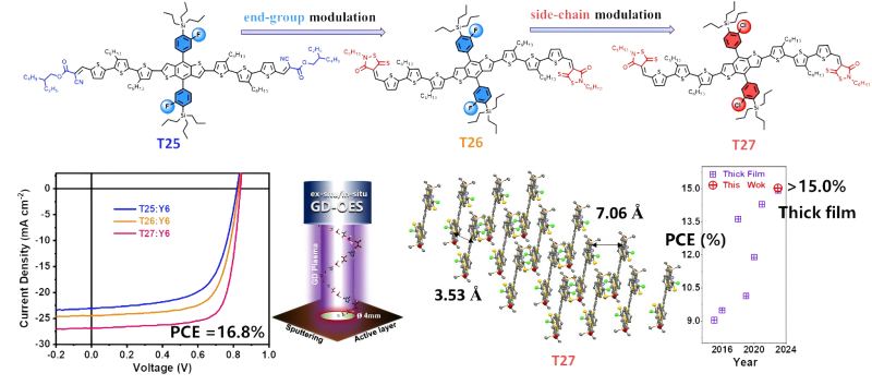 我们通过端基工程及侧链工程的策略对小分子给体逐步优化,分别设计合成了以氰基酯为端基的小分子给体T25,以罗丹宁为端基的T26以及以氯代为侧链的T27,并系统研究了端基及侧链工程对小分子给体理化性质、活性层生长机理和器件性能的影响,最终基于T27的小分子电池获得了高达16.8%器件效率,为二元小分子电池最高效率之一。且当其活性层膜厚超过300nm时,器件效率依然可以保持15%以上,这同时也是二元小分子电池厚膜最高效率之一。器件物理和形貌分析可知,基于T27:Y6的混合膜激子解离时间更短,受电荷复合及陷阱复合影响更小,载流子迁移率更平衡,分子π-π堆积更紧密,以及拥有更优异的互穿网络结构。此外,为了研究共混膜生长过程中给受体分子聚集及纵向分布情况,研究者首次将辉光放电发射光谱技术(GD-OES)应用于OSCs。通过原位与非原位测试结果表明,给受体结合度和薄膜生长速率与器件性能紧密相关。其中,相比于T26:Y6和T25:Y6两种共混膜,T27:Y6共混膜具有较高的给受体结合度与较慢的薄膜生长速率。这些结果均为T27:Y6的高性能提供进一步佐证。