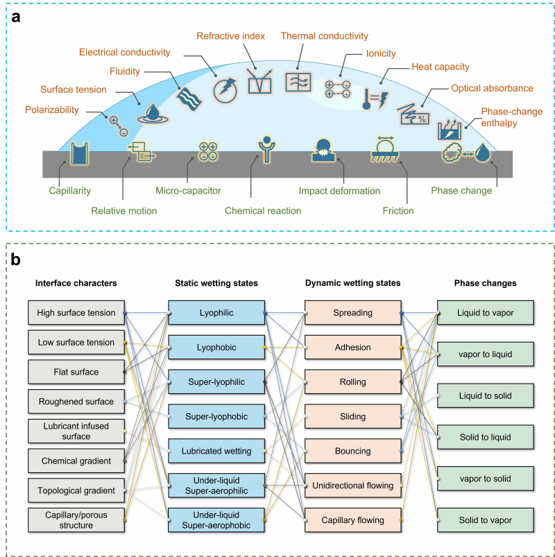 水-空气-固体界面作为自然界与工程技术中普遍存在的物理现象,其特性深刻影响着电、光、热等能量形式及信号在界面间的传输效率。这一界面不仅是能量与信号交互的桥梁,其性质更如同精密调控的阀门,对能量流与信号流的性质与行为产生深远影响。在理想状态下,能量与信号能够自发地穿越界面,如电荷沿电场梯度定向迁移、光线穿透透明介质、热量自然地从高温区域流向低温区域。然而,实际应用中,润湿界面往往成为制约能量与信号高效传输的瓶颈,具体表现为电流衰减、光线散射、热传导效率低下等现象。因此,对界面及其润湿性的精心设计显得尤为关键。这不仅是为了克服界面障碍,减少能量与信号的损失,更是为了实现对能量与信号传输过程的按需调控,以满足智能自适应设备对高效、精准能量管理的需求。通过调控界面的润湿性,我们能够精确控制界面上的能量与信号行为,为先进电子器件、光子元件及高效传热系统的设计与制造开辟新的途径,推动科技进步与产业升级。
