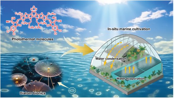 成果四:在全球人口快速增长和经济持续发展的背景下,耕地和淡水资源的短缺已经成为我们生活中日益严重的问题。太阳能驱动的界面水蒸发技术,利用太阳能界面集热的方式实现海水淡化,是最有希望获得高质量淡水的方法之一。近年来,科研人员在光热材料设计合成、太阳能蒸发器结构调控方面展开研究,不断提高蒸发器的蒸发速率和太阳能-蒸汽转换效率。其中,基于有机分子的光热蒸发体系以其质轻、低廉及结构可调等特点受到关注,然而在面向实际应用中面临着捕光效率低、循环性能差、易氧化失效等问题。基于此,我们提出了利用仿生界面的独特结构和润湿性配合有机共轭分子,实现高效捕光和循环稳定的光热海水淡化策略,研究结果为低成本、制备简易、抗盐耐用的太阳能蒸发系统和海上农业提供了新的思路。研究人员受水生硅藻的启发,通过简单的有机合成方法得到光热共轭分子,将光热分子负载到了低成本的木浆海绵纤维基材上,分别构建了具有水面下悬浮机制的蒸发器。在一个标准太阳光下,蒸发器的太阳能-蒸汽转换效率超过了88%,并且蒸发器的太阳能水蒸发效率最高达到1.62 kg m−2 h−1,这是目前基于纯有机分子蒸发器的最高效率之一。文章信息:Zhu J., Wang Y., Qiu X., Kong H., Li Y., Yan J., Zheng J., Chen S., Wang Y., andWang Y.*, Biomimetic Seawater Evaporator Based on Organic 3D Light Capture and Suspension-Protection Mechanism for In Situ Marine Cultivation.Adv. Funct. Mater.2023, 33, 2306604.
