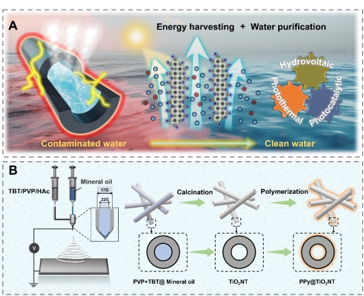 成果三:针对海洋开发中淡水和能源联合生产的需求,以及现有体系缺乏协同耦合机制以达到高效水电联产的现状,我们开发了一种基于聚吡咯包覆二氧化钛纳米管(PPy@TiO2NTs)的材料集成系统,该系统旨在实现太阳能驱动的电力和清洁水的联合生产,主要工作原理包括通过水伏发电效应进行电力生产,以及通过光热蒸发和光催化的双重机制来生产清洁水PPy@TiO2NTs的中空纤维结构显著增加了水流与材料界面的接触面积,并提升了流速,从而产生了更多的双电层(EDL),同时延缓了热量散失,并提供了丰富的催化活性位点。另一方面, PPy@TiO2NT界面强大的分子相互作用以及吸附性和极性的提升也促进了电荷的有效转移。因此,PPy@TiO2NT体系展现出了卓越的水伏发电和净水生产性能。文章信息:Xiao H., Zhu J., Ding L., Zheng J., Liu C., Du B., Chen S.,Wang Y*.Polypyrrole@TiO2 composite nanotube system with enhanced capillary fluid and charge transfer for high-current hydrovoltaic energy generation and seawater purification.Adv. Funct. Mater.2024, 2407669.