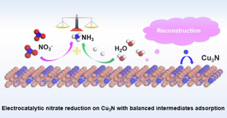 (4)该团队在期刊《Journal of Colloid and Interface Science》(影响因子:9.4,中科院大类一区)上发表题为“Enhanced electrochemical nitrate reduction on copper nitride with moderate intermediates adsorption”的研究论文。该研究基于氮化铜进行电催化硝酸盐还原,结合理论计算阐明了调控反应中间体的吸附能在促进催化过程提升中所发挥的关键作用,利用原位与非原位技术相结合手段,验证了催化剂在实际电位环境下的重构现象。魏金山副研究员为论文的第一作者,李亚运副教授为独立通讯作者,深圳大学材料学院为第一完成单位。