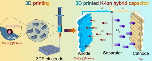 (2)该团队在期刊《Chemical Engineering Journal》(影响因子:15.1,中科院大类一区)上发表题为“Customizing CoSe2/Ti3C2Tn MXene hybrid inks toward high-energy-density 3D-printed K-ion hybrid capacitors”的研究论文。该研究基于3D打印技术结合CoSe2@Ti3C2Tn MXene负极材料构筑钾离子混合电容器,具有高能量密度和长寿命。质量能量密度高达199 Wh kg-1,循环6000圈后容量保持率为84.8%。这项工作将为开发稳定、安全、可靠的钾离子混合电容器开辟一条新的路径,并且可以推广到其他金属离子混合电容器。硕士生刘文峰为论文的第一作者,李亚运副教授为独立通讯作者,深圳大学材料学院为第一完成单位。