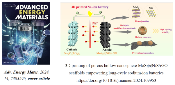钠离子电池作为最有吸引力的大规模储能设备之一,需要对容量和长循环性能进行优化。该研究结合高精度电极制备工艺3D打印技术,MoS2@NiS/rGO作为负极材料,通过电极结构设计和界面工程调控,材料倍率性能和循环稳定性得到了显著提高。这项工作是该研究团队继2024年初,在《Advanced Energy Materials》期刊发表封面论文后(下图左,3D printed sodium-ion batteries via ternary anode design affording hybrid ion storage mechanism, Adv. Energy Mater. 2024, 14, 2303296, cover article,https://doi.org/10.1002/aenm.202303296),关于3D打印制备钠离子电池的又一研究成果,为钠离子电池器件的设计和制备提供新的思路。