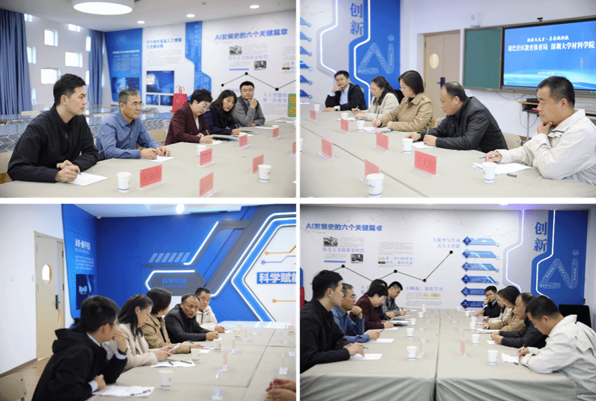 材料学院吕茜书记,实验中心敖伟琴主任,王大刚副主任,材料系刘东助理教授,高分子系向雄志副教授,与康巴什区教育体育局、康巴什青少年发展中心相关领导进行座谈,聚焦课程、师资、实践三大核心内容,构建一体化育人链。在课程开发上,依托深圳大学材料学院的前沿科研资源,共同打造一套衔接中学基础与大学前沿、激发学科兴趣的模块化课程体系,推动科普教育从“知识普及”向“兴趣引导”和“创新思维培养”升级。在师资培育上,建立常态化教研机制,通过“高校专家驻点指导”“双师课堂”等形式,为我区科技教师提供深度研修平台,赋能教师专业成长。在学生实践上,打通“讲座——夏令营——课题研究”的进阶通道,为学有余力的学生提供“小小科学家”课题指导,早期发掘和培养创新型后备人才。
