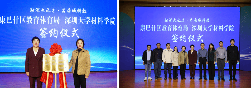 2025年10月27日,深圳大学材料学院与内蒙古自治区鄂尔多斯市康巴什区教育体育局合作签约暨“康巴什区研学实践教育基地”授牌仪式在康巴什区青少年发展中心成功举行。深圳大学材料学院党委书记吕茜与康巴什区教育体育局党组书记、局长李美荣共同签署协议并揭牌。