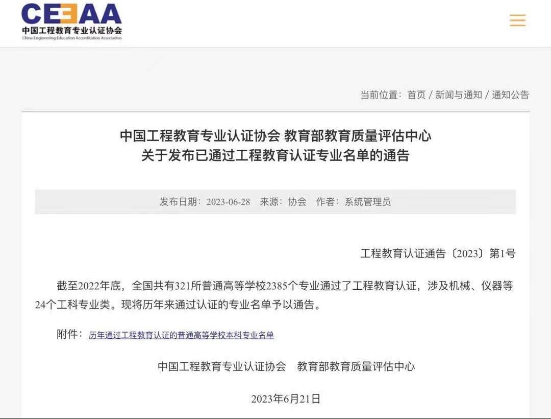 6月28日,中国工程教育专业认证协会和教育部高等教育教学评估中心正式发布了《中国工程教育专业认证协会教育部教育质量评估中心关于发布已通过工程教育认证专业名单的通告》,经过学校自评、自评审核、专家组现场考查、结论审议等程序,我院高分子材料与工程专业顺利通过了工程教育专业认证,有效期为6年,自2023年1月至2028年12月。