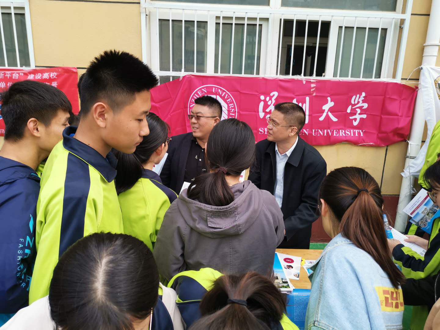 在咨询环节,同学们领取了深大宣传折页,热情高涨,可以看出他们对深大有很浓的兴趣。材料学院老师就同学们的问题一一做了解答。