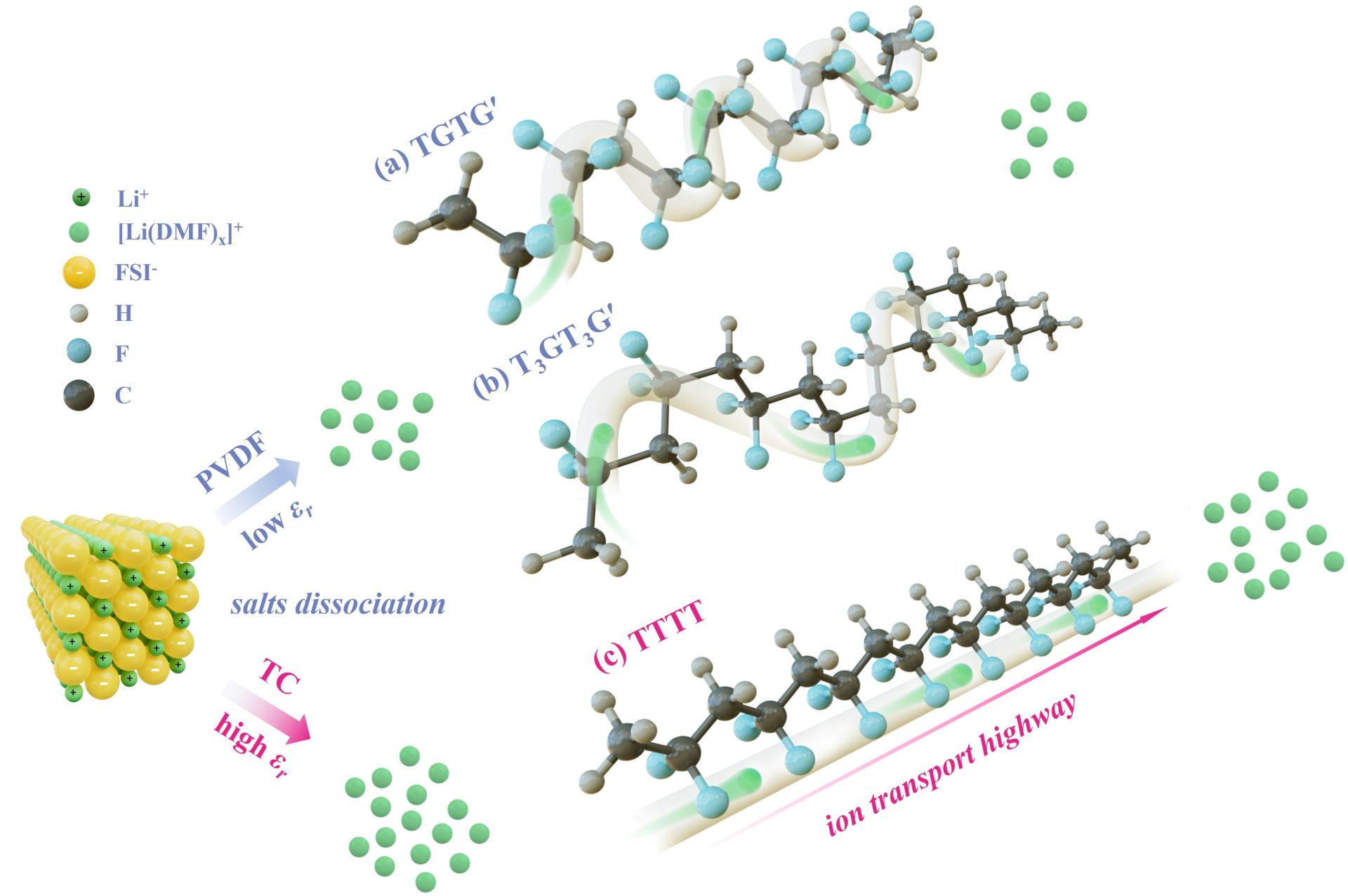 Through conformational regulation of the high dielectric P(VDF-TrFE-CTFE), an all-trans conformation with all F atoms located on one side of the chain is achieved, which constructs ion hopping highways and results in a high lithium-ion transference number of 0.61. Both the Li//Li symmetric cells and the high-voltage NCM811//Li cells show long-term cycling stablity at 25 oC.