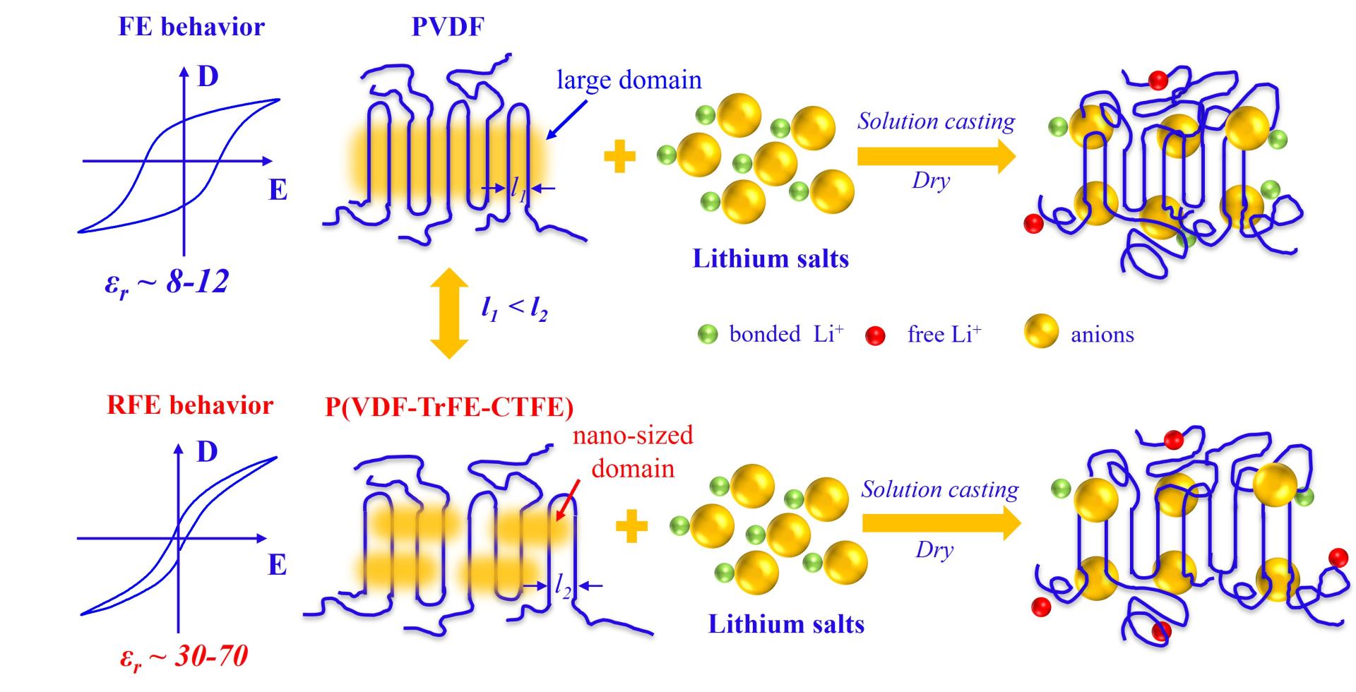 A unique relaxor ferroelectric P(VDF-TrFE-CTFE) is investigated as a matrix of SPEs. The P(VDF-TrFE-CTFE) with ultrahigh dielectric constant not only promotes the dissociation of LTFSI to form more free lithium ions but also brings a larger transference number of lithium ions and lower activation energy.
