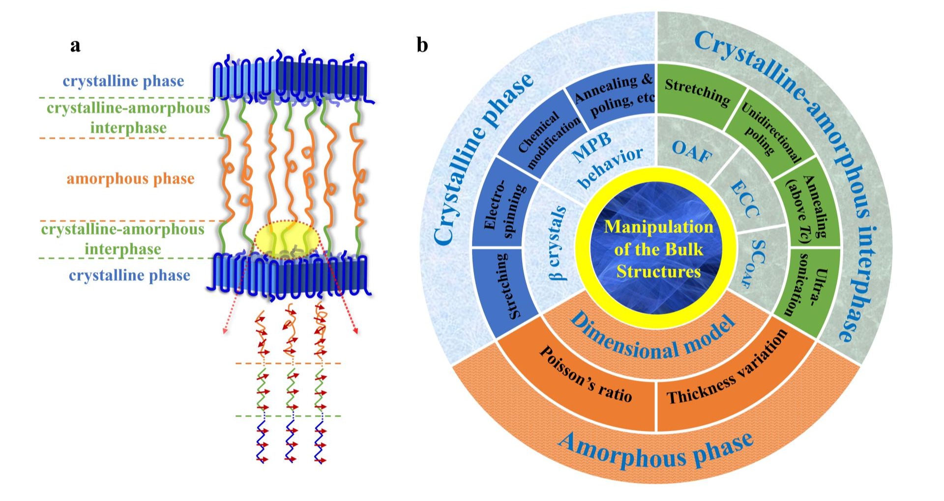 Here, the basic principles and measurement methods for piezoelectric coefficients of ferroelectric polymers are introduced. Approaches to improve piezoelectric property are discussed from the structure manipulation of the amorphous phase, the crystalline phase, and the crystalline–amorphous interface. Especially, the crucial role of the oriented amorphous fraction in enhancing piezoelectricity of poly(vinylidene fluoride)-based polymers is discussed.
