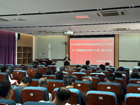 To enhance laboratory safety management and reinforce the accountability of laboratory safety officers, the College of Materials Science and Engineering convened its 2025 Laboratory Safety Work Conference on the afternoon of September 16. The meeting included the signing of the Laboratory Safety Responsibility Agreements. Attendees included Party Secretary Lv Qian, Vice Dean Zhu Deliang, all designated laboratory safety officers, and all members of the Experimental Center, totaling 73 participants.