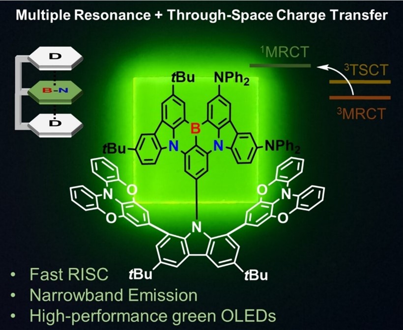 In response to the above issues, a "dual steric and electronic effects " strategy was proposed by the team of Professor Chuluo Yang and Professor Kai Li from Shenzhen University. This strategy brought two advantages by ingenious molecular design. First, the introduction of a new through-space charge transfer (TSCT) state energetically between the first singlet excited state (S1) and the first triplet excited state (T1) localized on the B-N core can facilitate the RISC process. Second, the steric effects of the lateral donors are conceived to block inter-luminophore interactions and thus mitigate the concentration quenching for typical B-N MR emitters. The prepared pure green OLED device achieved maximum external quantum efficiency (EQE) of up to 31.7% with a high brightness of ca. 128153 cd m-2, and exhibited a good operational stability with LT95of 85.2 h at an initial luminance of 1000 cd m-2. Meanwhile, the heavily doped device showcased maximum EQE of 26% along with the maximum luminance of ca. 72000 cd m-2, and the observation suggested that the present molecular design effectively inhibited intermolecular interactions and reduces the ACQ effect.