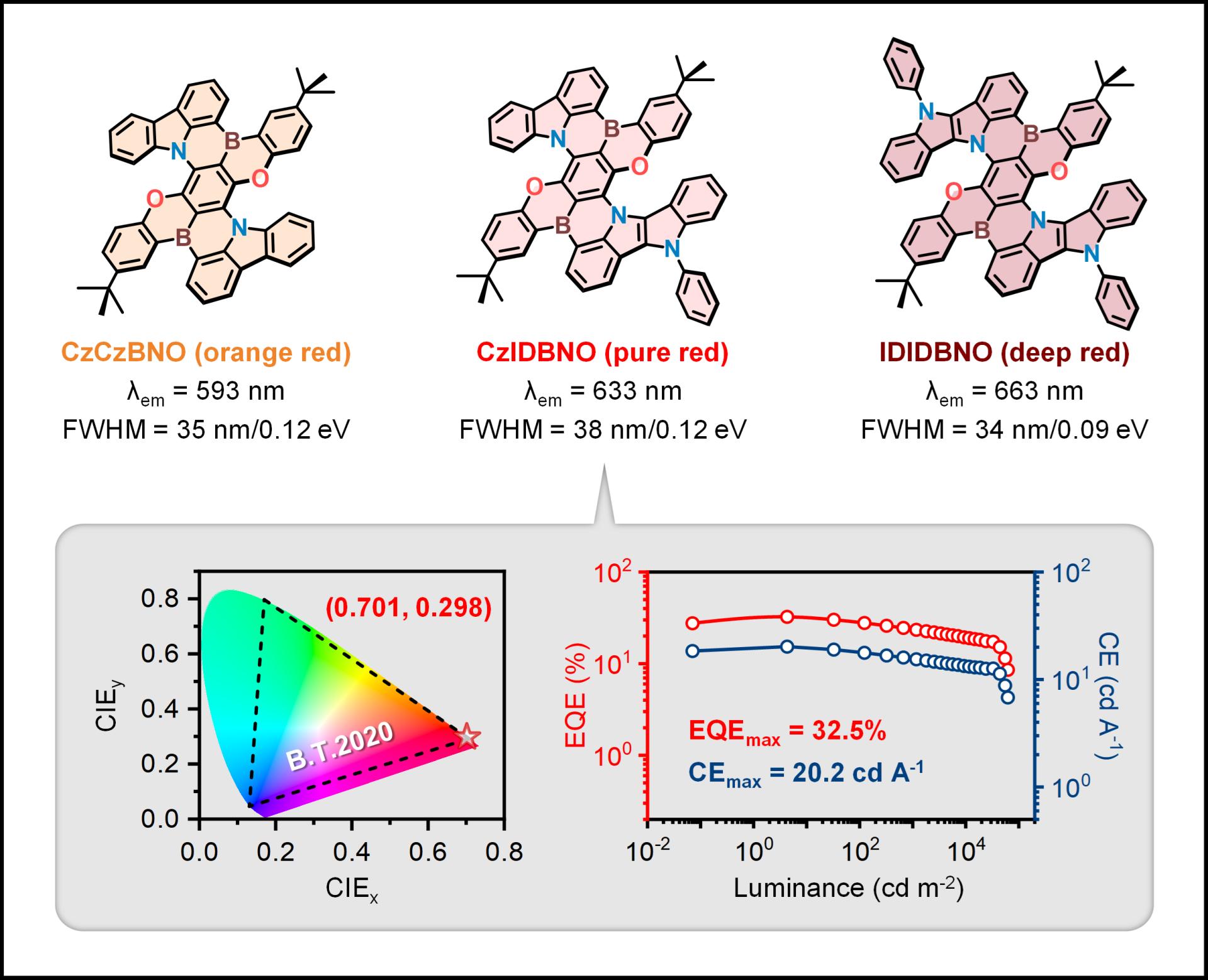 The development of multi-resonance organic electroluminescent materials has greatly advanced the progress of organic light-emitting diode (OLED) panels for achieving ultra-high-definition displays. Thanks to the strong molecular rigidity and alternating frontier orbital distribution of multi-resonance luminescent materials, such materials have the advantages of narrow-band emission and high luminescent quantum efficiency. However, due to the short-range charge transfer characteristics within the molecules, the development of highly efficient narrow-band pure red light-emitting materials presents a significant challenge compared to blue and green light.
