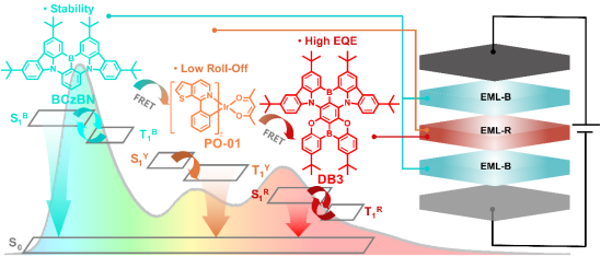 White organic light-emitting diodes (WOLEDs) are regarded as highly promising next-generation lighting sources due to their potential advantages such as flexibility, low power consumption, and eye-friendly illumination. However, the lack of stable blue emitters capable of efficiently utilizing triplet (T1) excitons has significantly limited the power efficiency and operational lifetime of WOLEDs, posing a critical bottleneck for their future large-scale commercialization.