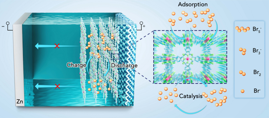 To address the aforementioned issues, Assistant Professor Zhuoxin Liu of Shenzhen University, Professor Chunyi Zhi of City University of Hong Kong, and Assistant Professor Hongfei Li of Southern University of Science and Technology developed a high-performance aqueous NF-ZBB that employs a two-dimensional conjugated metal-phthalocyanine nickel (NiPPc) as an adsorption-catalysis cathode host. The NiPPc cathode host presents several distinct advantages: (1) Atomically dispersed Ni-N4 sites offer a plethora of catalytically active sites. Compared to carbon atoms, these dense metal centers exhibit relatively stronger polarity, providing rich adsorption sites for bromine and polybromide ions. (2) The π-π stacked layered phthalocyanine-based metal-organic framework ensures effective charge carrier transport, thereby enhancing redox kinetics. (3) The porous structure favors high bromine loading. As a result, the non-flow zinc-bromine batteries constructed using the NiPPc host witnessed remarkable improvements in electrochemical performance, encompassing specific capacity, rate capability, cycle stability, and discharge plateau voltage. Employing potassium bromide as the active material, the battery demonstrated a high specific capacity (240 mAh g−1KBr) at a current density of 5 A g−1, maintaining approximately 95% capacity retention and about 99% Coulombic efficiency over 3000 cycles. NiPPc's significant catalytic activity also enabled the battery to achieve a high discharge plateau voltage of up to 1.82 V at a current density of 2 A g−1, which is close to the theoretical discharge voltage. These findings, titled "Boosting aqueous non-flow zinc–bromine batteries with a two-dimensional metal–organic framework host: an adsorption-catalysis approach", were published in the prestigious journal Energy & Environmental Science. The first author of this article is Dr. Hua Wei, a postdoctoral researcher at Shenzhen University.