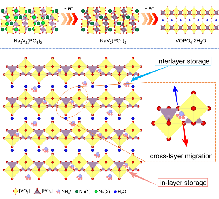 Non-metallic cations, such as NH4+, have demonstrated rapid kinetic transmission and superior rate capabilities when used as carriers in aqueous secondary batteries. The small hydrated ion size (3.31 Å) and its unique topological chemical properties indicate its vast potential for applications. To date, numerous studies have focused on ammonium ion storage materials, with transition metal compounds having tunnel and layered structures drawing significant attention. However, the majority of the research on layered materials predominantly emphasizes interlayer hydrogen bond diffusion mechanisms, often overlooking the functionality of the intrinsic layer structure. In actuality, channels also exist on the layer itself, analogous to tunnels within the layers of materials. This suggests that ammonium ions can not only migrate between layers but also undergo cross-layer transfer within them. Consequently, it is of paramount importance to re-evaluate the role of these in-layer channels in the storage and migration processes of ammonium ions.